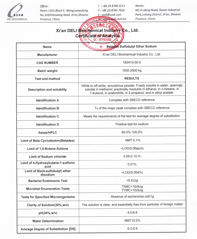 Betadex Sülfobutil Eter Sodyum SBECD'nin her partisi, yüksek test saflığı, düşük endotoksin seviyeleri ve minimum düzeyde kalıntı solvent ve ağır metal sağlamak üzere test edilir. Betadex Sülfobutil Eter Sodyum SBECD, USP ve EP farmakope spesifikasyonlarına uygundur ve dünya çapındaki farmasötik uygulamalar için tutarlı kaliteyi garanti eder.
