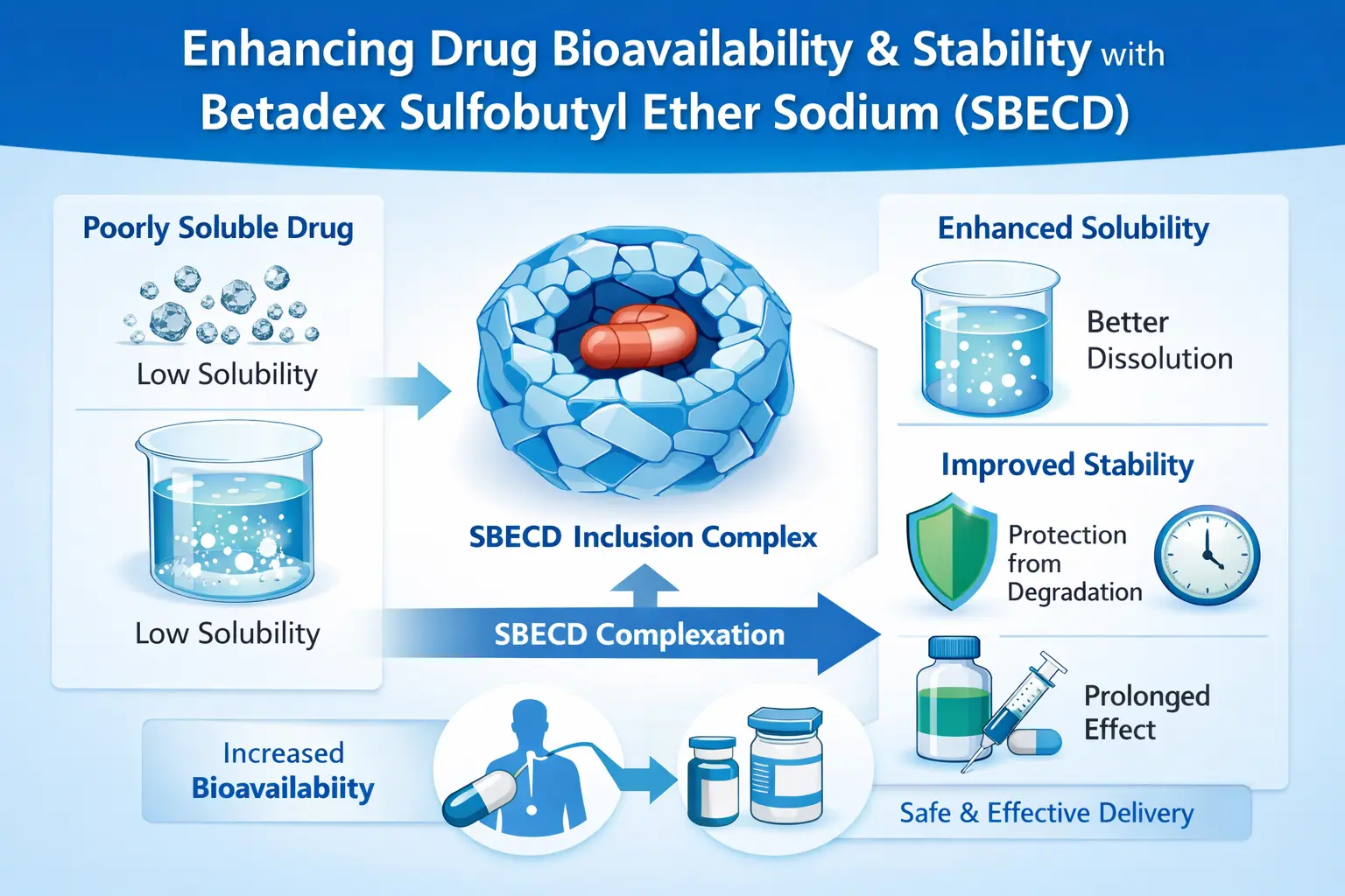 SBECD'nin benzersiz kimyasal yapısı bu problemin üstesinden gelmesine yardımcı olur. Siklodekstrin omurgası hidrofobik ilaç molekülleri için yer açar ve sülfobütil eter grupları ilacın suda çözünmesini çok kolaylaştırır. İki özelliği olduğundan SBECD, ilaç dağıtımının harika bir yoludur.